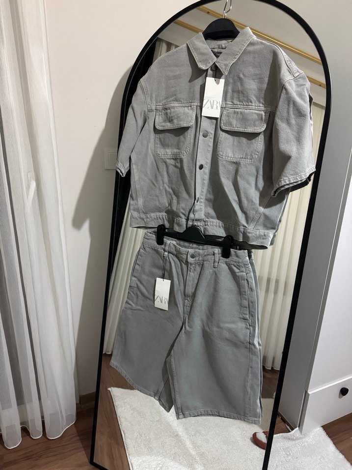 Gri denim kumaştan yapılmış, kısa kollu ve düğmeli ceket ile uyumlu şorttan oluşan erkek takımı. Ceket, kesik yakalı ve rahat kesimlidir, günlük kullanıma uygundur.