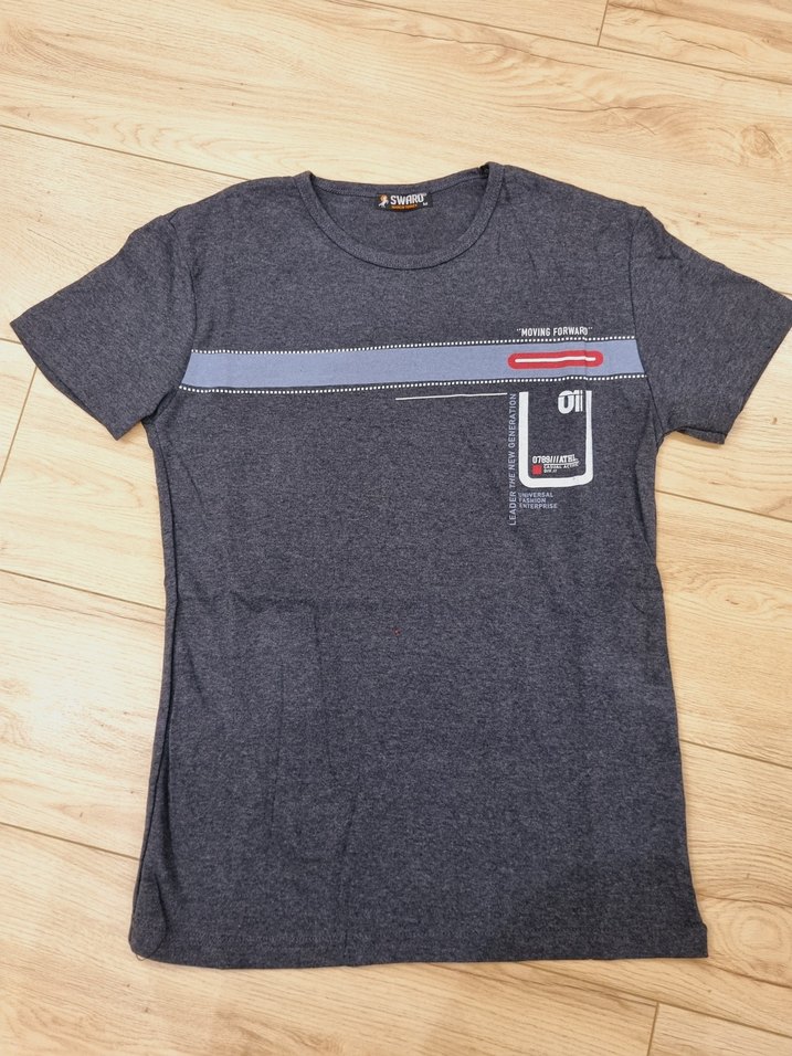 M beden gri denim kısa kollu tişört, bisiklet yaka ve baskılı desenli, rahat kesim ve günlük sokak stili sunar.