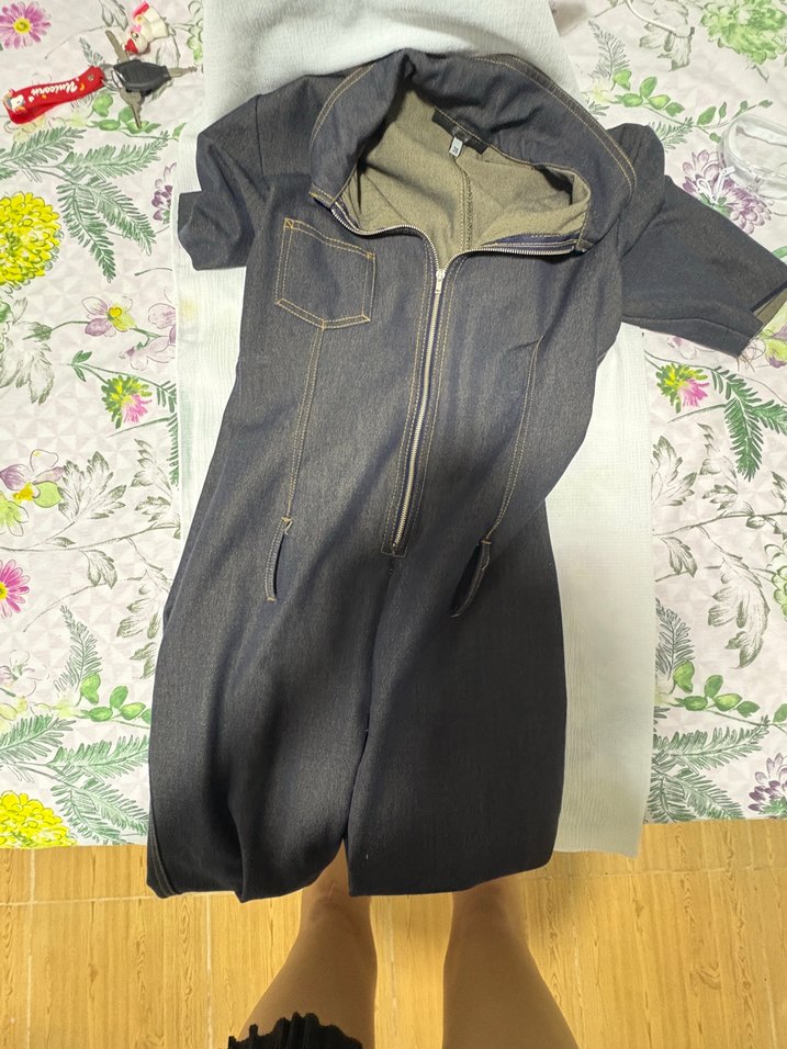 Gri renkli, kısa kollu, yüksek yakalı ve fermuarlı önü olan, diz altı uzunlukta hamile jean tulumu. Sokak modasına uygun rahat bir parça.
