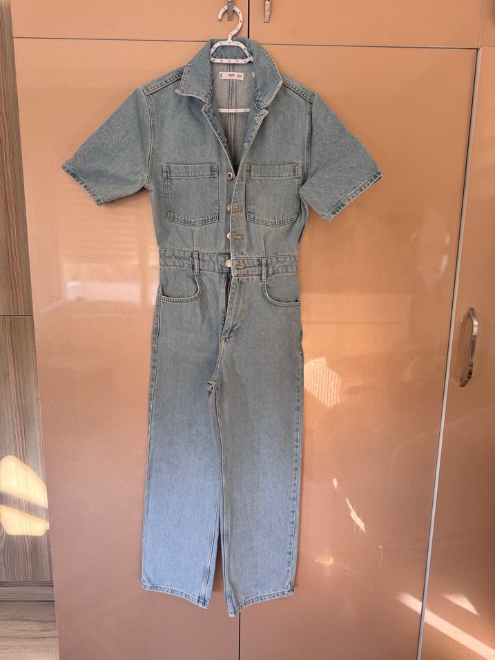 Gri renkte, kısa kollu, düğmeli ve yakalı denim tulum. Rahat kesimi ve midi boyuyla günlük sokak stiline uygundur.