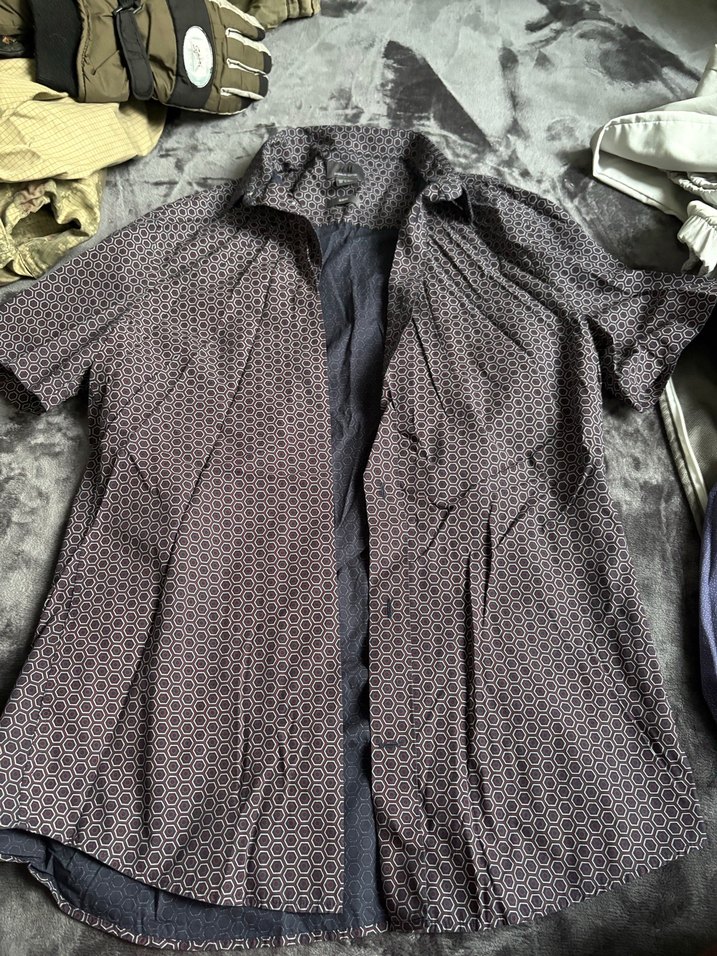 Gri renkli, kısa kollu, düğmeli ve yakalı erkek gömleği. Sıkı kesim ve sentetik kumaştan, gündelik sokak stiline uygun.