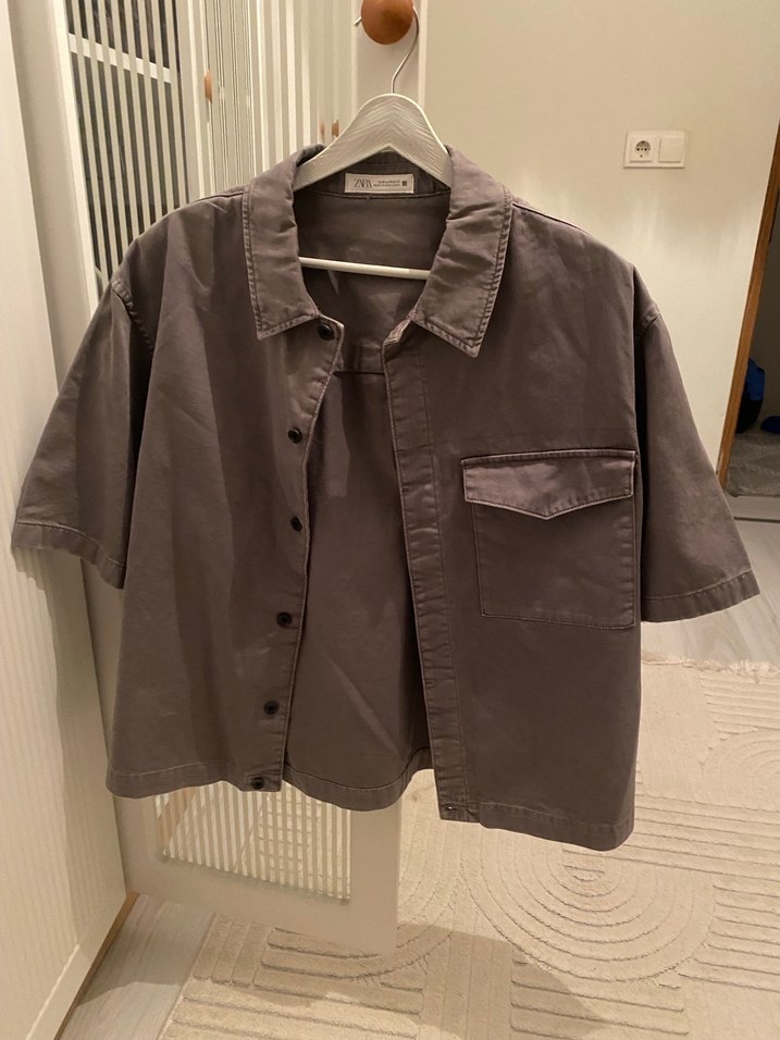 Gri renk, kısa kollu, düğmeli, yakalı, keten kumaştan rahat ve bol kesim erkek gömleği. Günlük kullanıma uygun, sade ve şık bir parça.