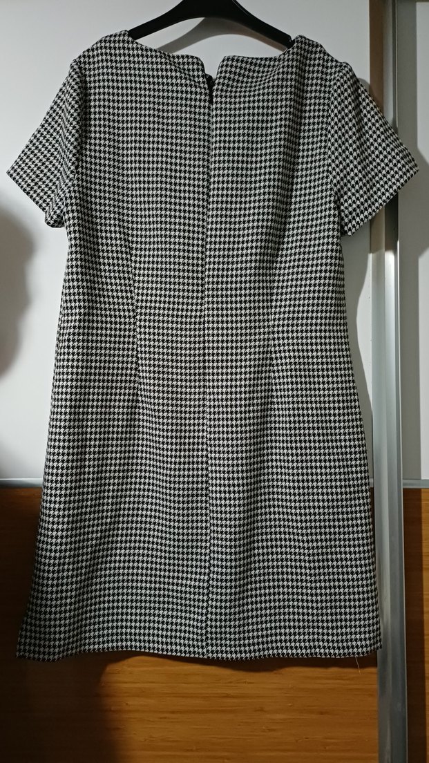 Gri renkte, kısa kollu, V yaka ve düğmeli önü olan midi boy elbise. Sentetik kumaştan, düz kesim ve kareli desene sahip, günlük kullanım için uygundur.