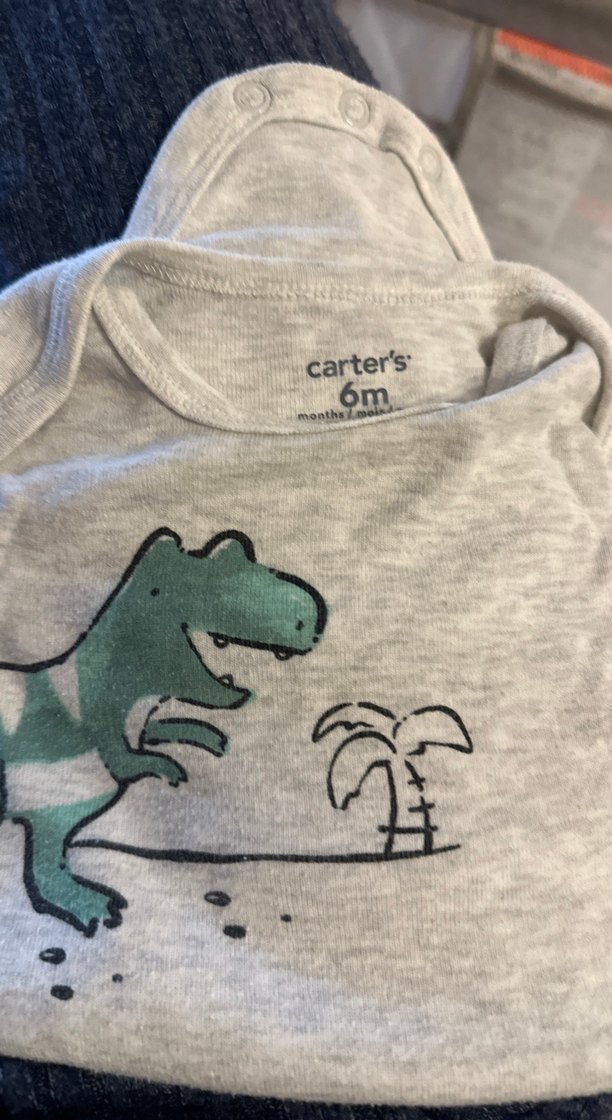 Gri kısa kollu erkek bebek body, yuvarlak yaka ve dinozor baskılıdır. Yumuşak pamuktan üretilmiştir. Carter's markası, 6 aylık için uygundur.