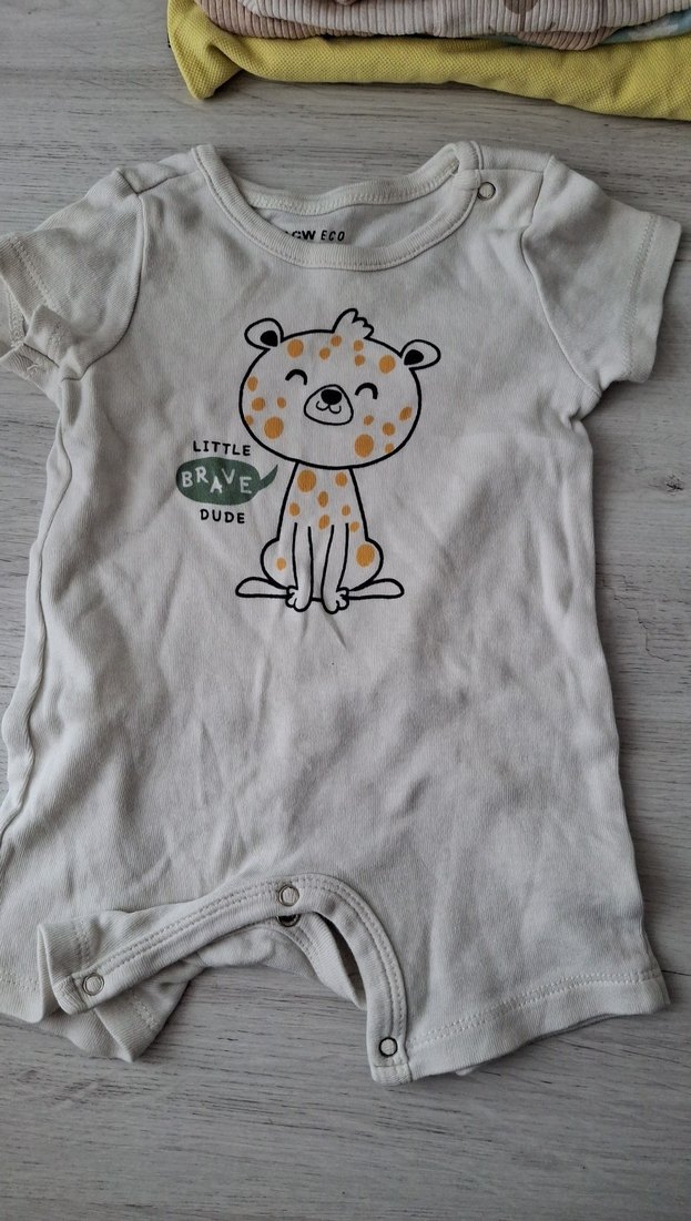 Gri kısa kollu, düğmeli, yumuşak ve sıcak kumaştan erkek bebek tulumu. Üzerinde sevimli hayvan ve yazı baskısı bulunur.
