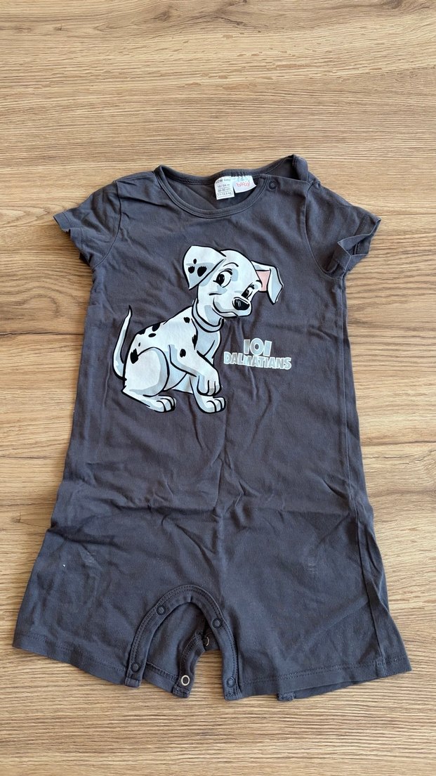 Gri renkli, kısa kollu, yuvarlak yakalı bebek tulumu, pamuk kumaştan üretilmiş, sevimli Dalmaçyalı baskılıdır.