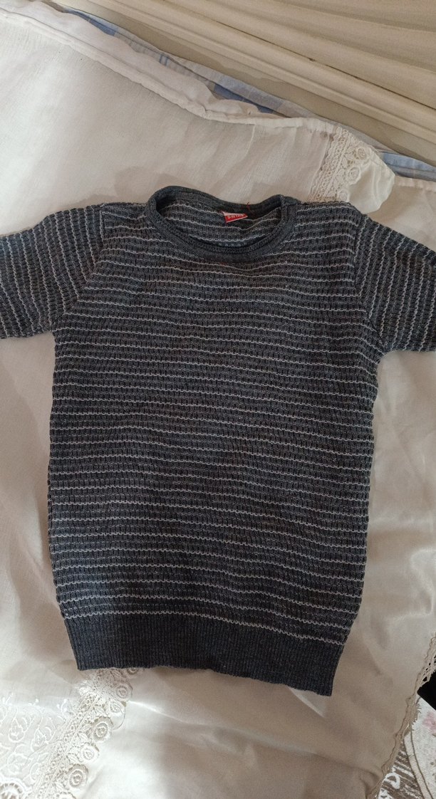 Gri renkte, kısa kollu, yuvarlak yaka, bol kesim erkek çocuk triko kazak. Örgü kumaştan, sade ve basic tarzda sokak giyimine uygun.