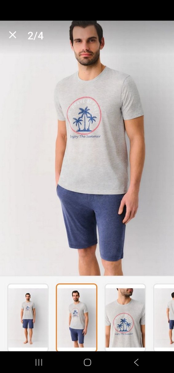 Erkek pijama takımı, kısa kollu ve yuvarlak yakalıdır. Gri baskılı üst ve mavi şortlu, rahat ve şık bir görünüme sahiptir.