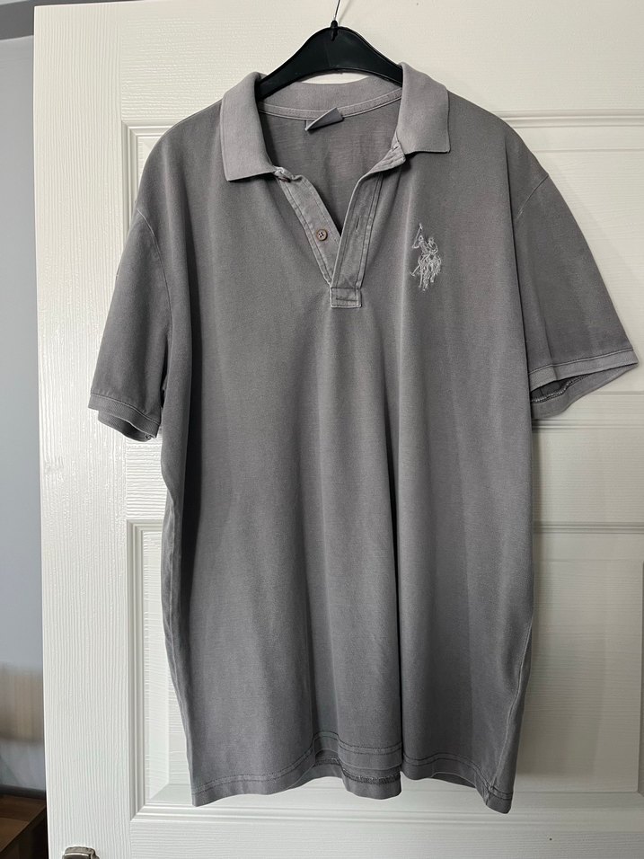 Gri renkli, kısa kollu, düğmeli yakalı erkek polo tişört. 1-2 kez giyildi. Eşim zayıflama sürecindeyken almıştı zayıfladığı için şuan olmuyor.