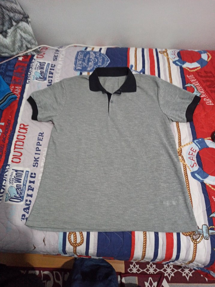 Gri renkte, düğmeli yakalı ve kısa kollu erkek polo tişört. Rahat kesim ve sentetik kumaştan, gündelik sokak stili için uygundur.