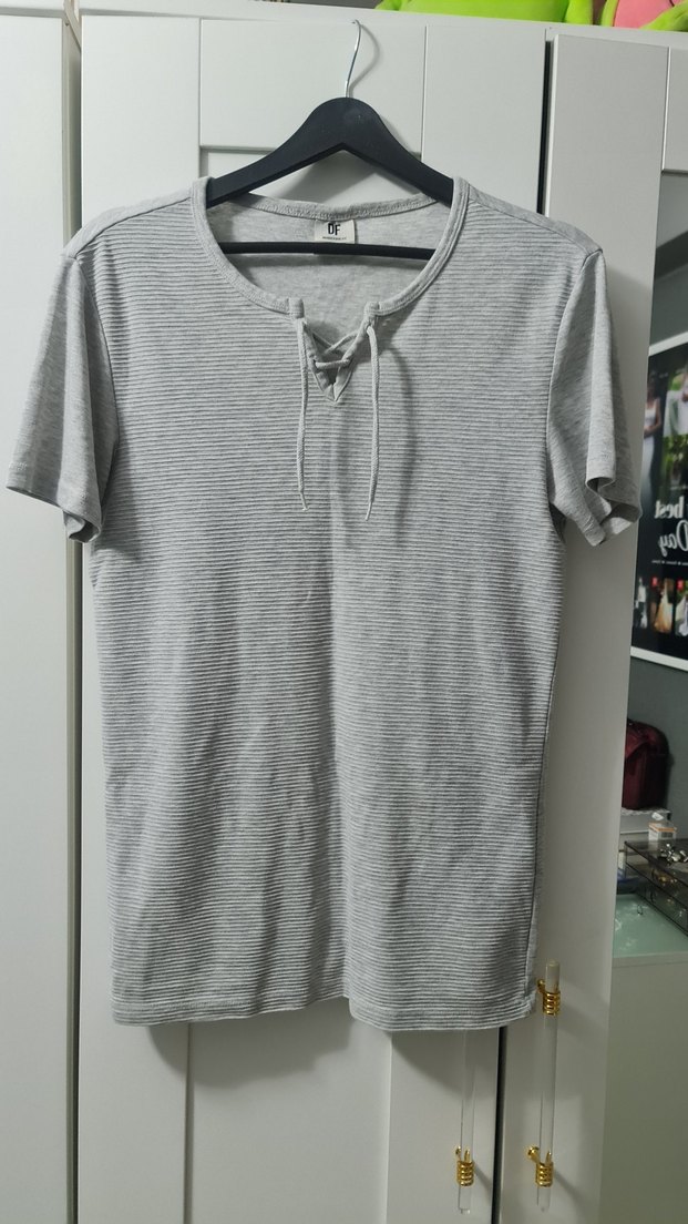 Gri renkte, kısa kollu ve bağcıklı yuvarlak yakalı erkek tişörtü. Yumuşak kumaştan, rahat kesim ve günlük kullanıma uygun sokak tarzında.