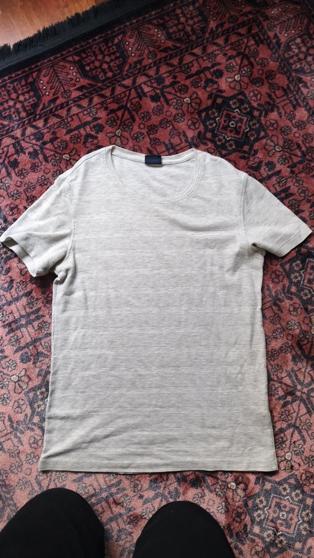 Gri renkli, keten kumaştan, kısa kollu ve yuvarlak yakalı erkek tişörtü. Rahat kesimiyle gündelik sokak stiline uygun.