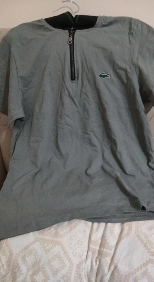 Gri renkli, kısa kollu, fermuarlı ön detaya sahip erkek polo tişörtü. Keten kumaştan, rahat ve bol kesimdir, günlük sokak stili için uygundur.