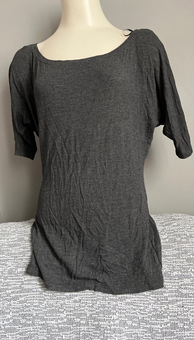 Gri renk, kısa kollu, kayık yaka, rahat kesim hamile bluzu. Yumuşak keten kumaştan, drapeli ve midi boyda, günlük rahat kullanıma uygun.