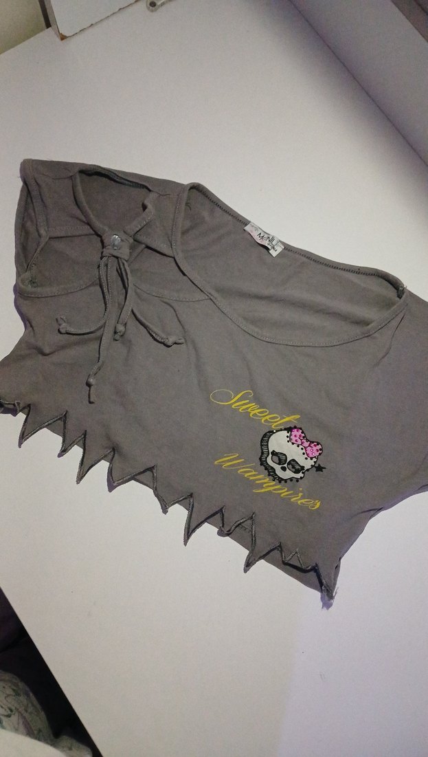 Kolsuz, gri renkli hamile bluzu, baskılı kafatası deseni ve fırfır detaylarına sahiptir. V yaka ve bol kesim, yumuşak örme kumaştan üretilmiştir. Parti için uygun, gotik punk tarzında.
