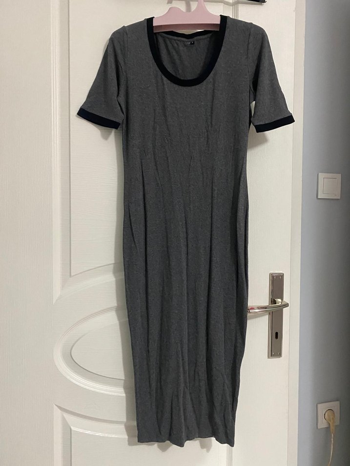 Gri renkli, kısa kollu ve yuvarlak yakalı hamile elbisesi. Uzun ve vücuda oturan kesimiyle sade ve şık bir görünüm sunar.