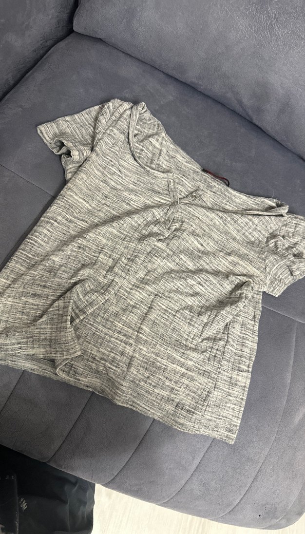 Gri renkte, yumuşak keten kumaştan yapılmış, bol kesim hamile tişörtü. Kısa kollu ve V yaka detaylı, günlük kullanıma uygun şık bir parça.