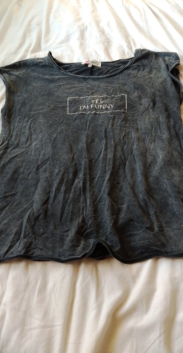 Gri keten hamile tişörtü, kısa kollu ve salaş kesimdir. 'YES I'M FUNNY' baskılıdır, günlük giyime uygun goth ve grunge punk tarzını yansıtır.
