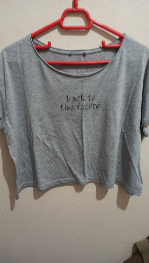 Gri renkli, kısa kollu, yuvarlak yaka ve bol kesim hamile tişörtü. Önünde 'back to the future' yazılı baskı ve düğme detayları vardır. Sentetik kumaştan üretilmiştir, dış mekan kullanımı için uygundur.