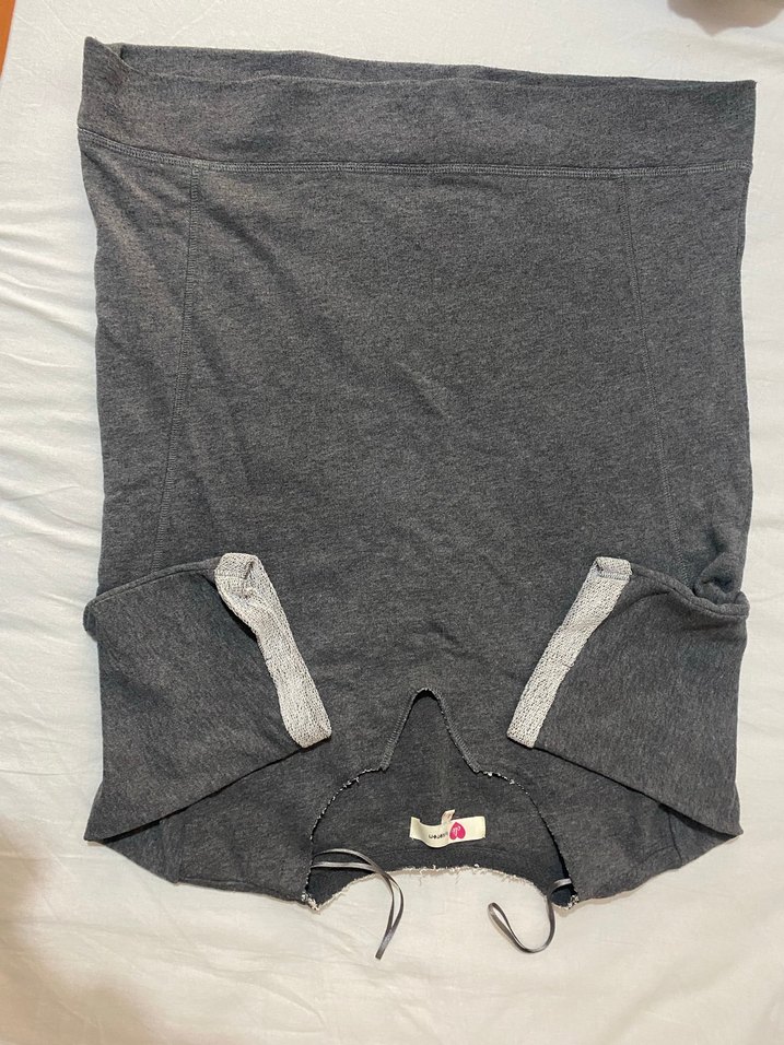 Gri renkte, kısa kollu ve bisiklet yaka hamile tişörtü. Yumuşak sentetik kumaştan, fermuarlı ve midi boyda, günlük sokak stiline uygun.