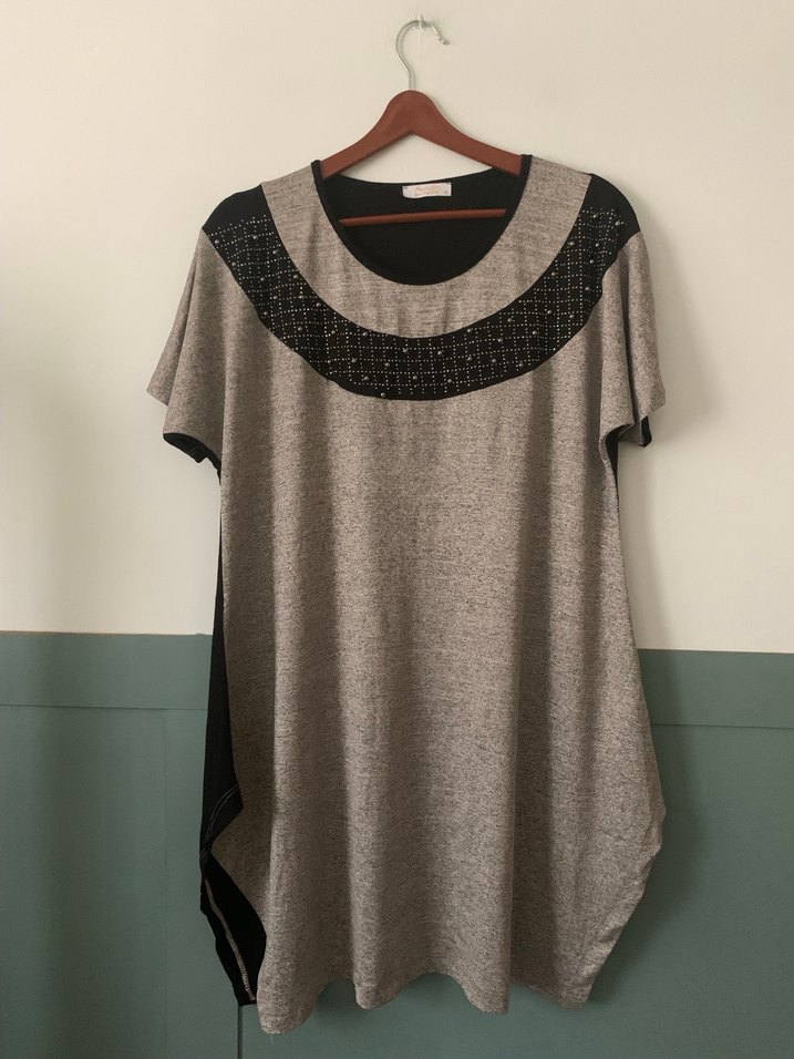 Gri triko kumaştan, kısa kollu ve yuvarlak yakalı, bol kesim hamile tunik. Baskılı detaylar ve dökümlü tasarımıyla günlük kullanıma uygundur.