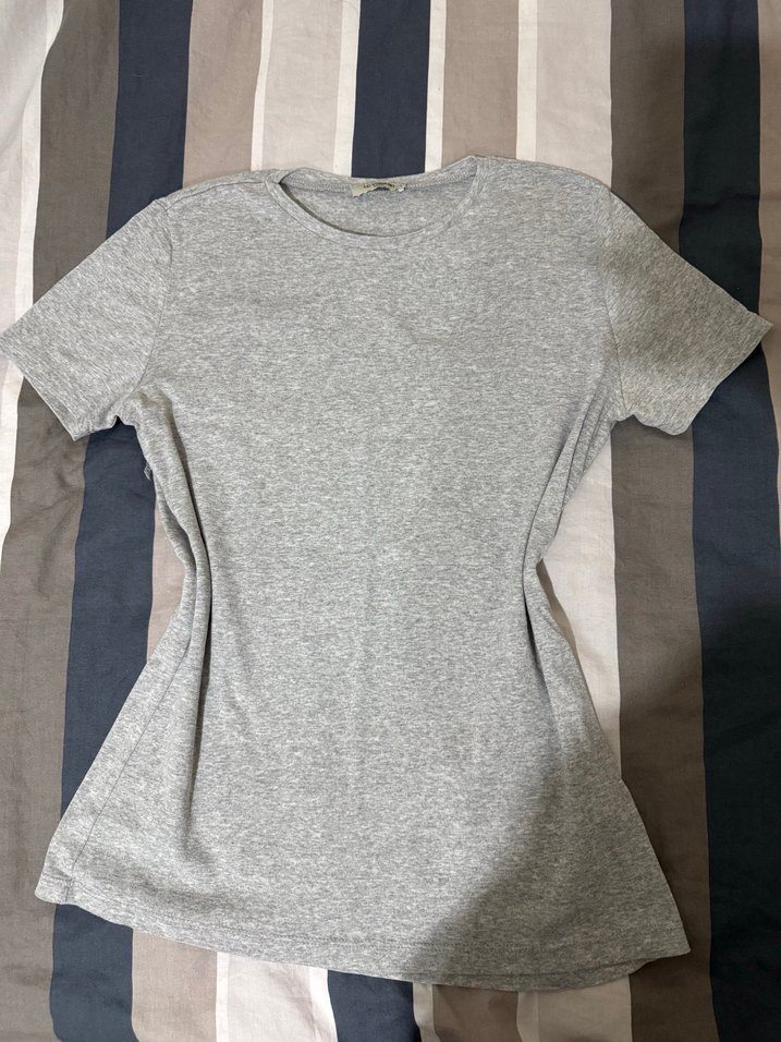 Pamuk kumaştan, kısa kollu ve bisiklet yaka, gri renkli, beden oturan kadın tişörtü. Günlük kullanım için uygun ve sade tasarım.