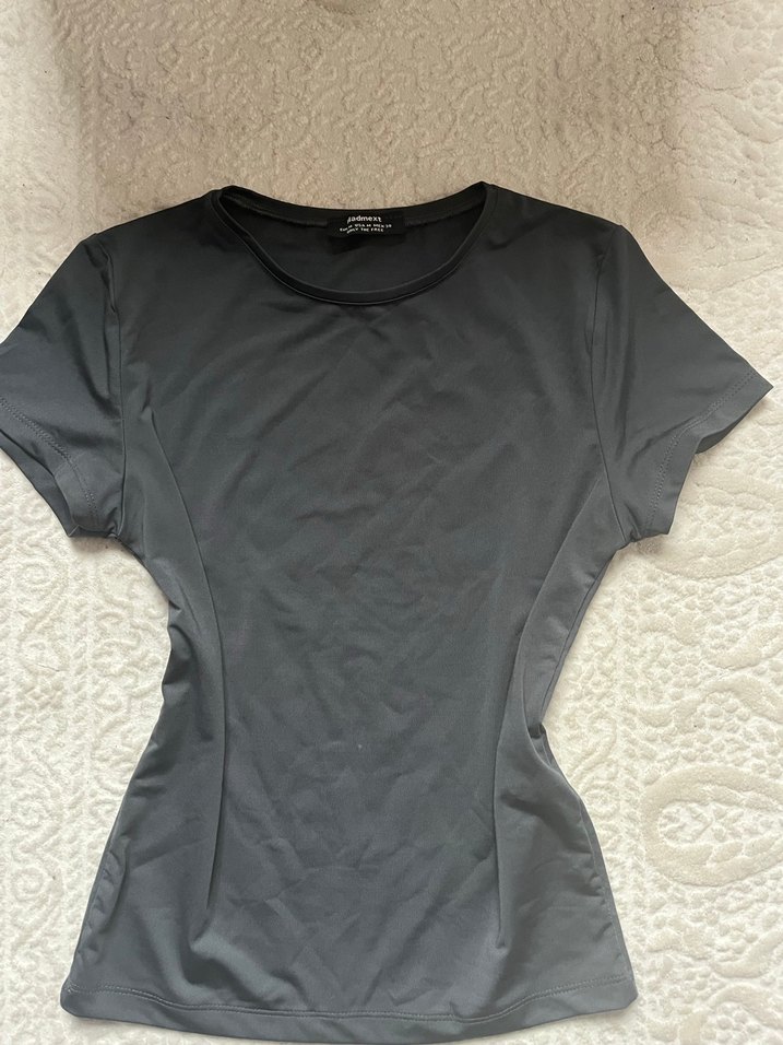 Fitted kesim, yuvarlak yaka ve kısa kollu gri kadın tişörtü. Pürüzsüz sentetik kumaştan, sade ve şık dış mekan kullanımı için uygundur.