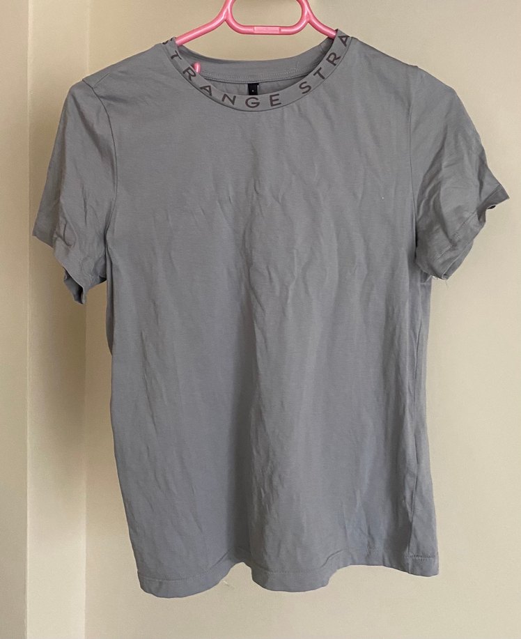 Gri renkli, kısa kollu ve yuvarlak yakalı kadın tişörtü. Nefes alan keten kumaştan, gevşek kesim ve baskılı yaka detayıyla günlük rahat stil için uygundur.