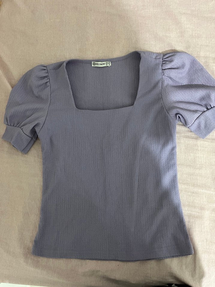 Yumuşak keten kumaştan yapılmış, kısa pilili kollu ve kare yakalı, vücuda oturan gri bluz. Günlük sokak stiline uygundur.