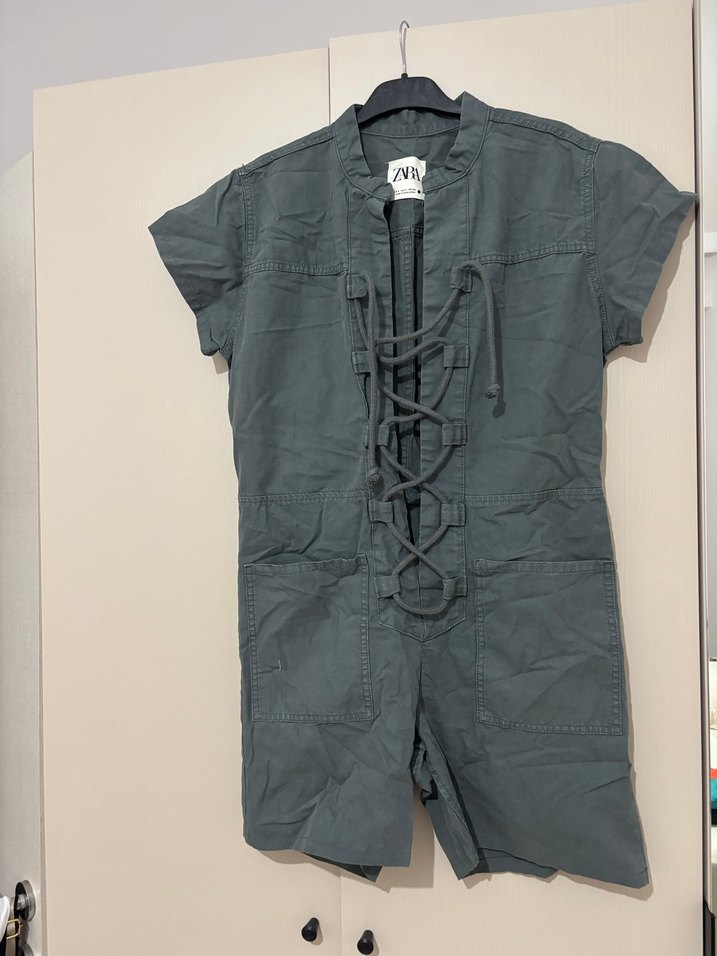 Gri renkli kısa kollu, kemerli kısa tulum. Nefes alabilir keten kumaştan, halter yaka ve bağcıklı ön detaylı, günlük sokak stiline uygun.