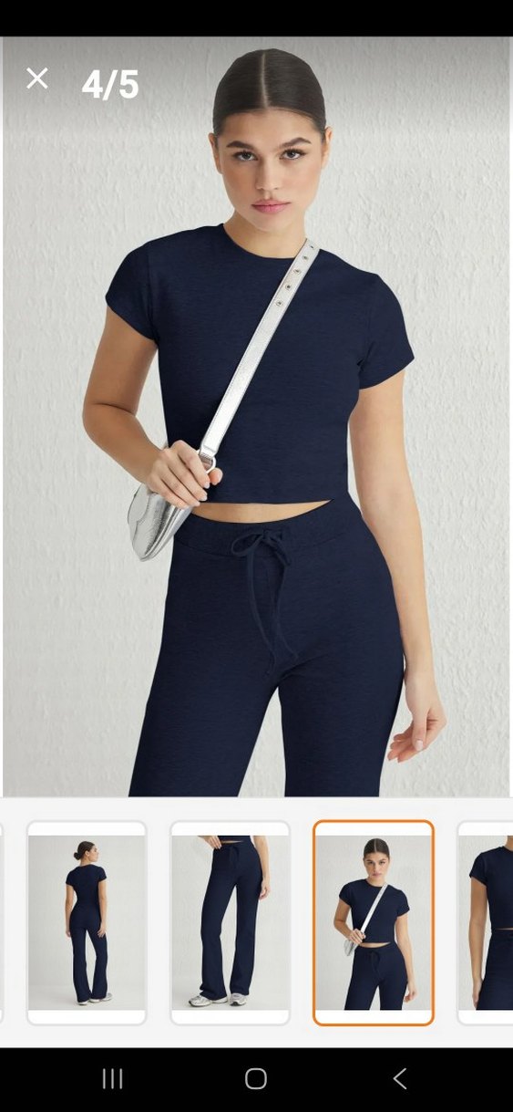 Kısa kollu, yuvarlak yakalı ve kemerli, düzgün sentetik kumaştan yapılmış uyumlu spor üst. Spor ve günlük kullanıma uygun.