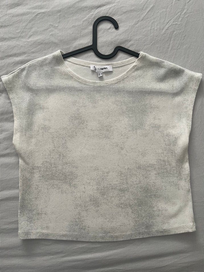 Nefes alabilen keten kumaştan, gri, kısa kollu, yuvarlak yakalı, salaş kesim crop top. Hafif batik desenli ve outdoor stil için uygun.