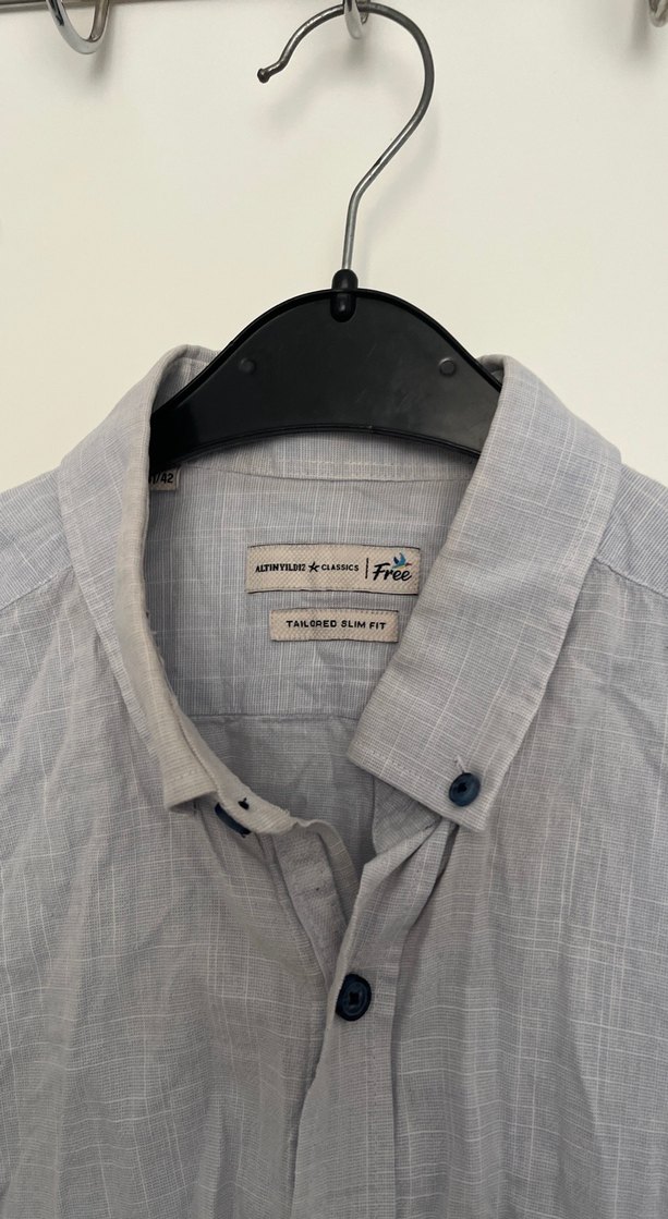 Gri renkli keten kumaştan, düğmeli ve yakalı kısa kollu erkek gömleği. Rahat kesimi ve hafif baskılı deseni ile gündelik ve ofis kullanımı için uygundur.