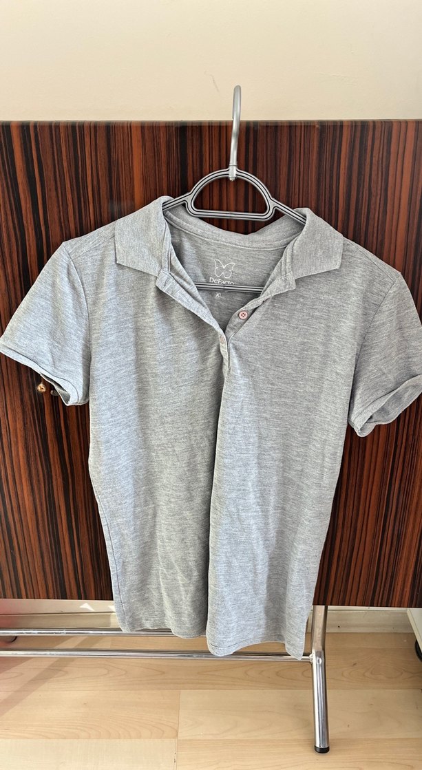 Gri renk, keten kumaştan, düğmeli, kısa kollu, yakalı ve bol kesim polo tişört. Günlük kullanıma uygun rahat bir parça.