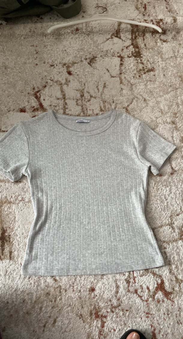 Gri, kısa kollu, keten kumaştan, düz ve fitted kesime sahip tişört. Rahat ve şık bir görünüm sunar. yeni alındı hiç giyilmedi defosu yoktur