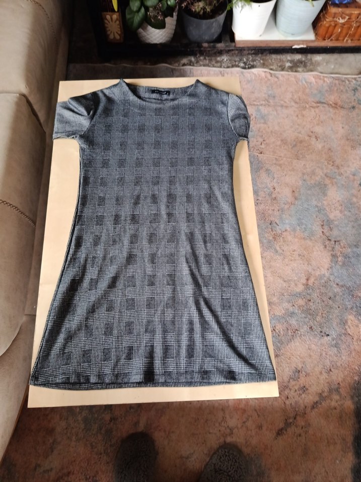 Kısa kollu, yuvarlak yakalı, gri elbise, ince kesimi ve hafif kare desenleriyle günlük sokak stiline uygun rahat bir şıklık sunar.