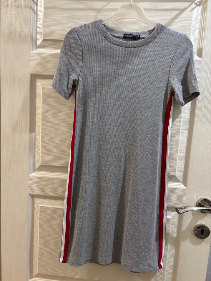 Gri midi elbise, kısa kollu ve bisiklet yakalıdır. Yanlarda şerit detayları ve yırtmaçlar bulunur. Rahat ve şık sokak stili için uygundur.