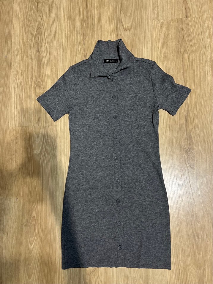 Gri midi elbise, kısa kollu, yakalı ve düğmeli ön detaylıdır. Vücuda oturan kesimi ve yumuşak sentetik kumaşıyla gündelik kullanım için uygundur.