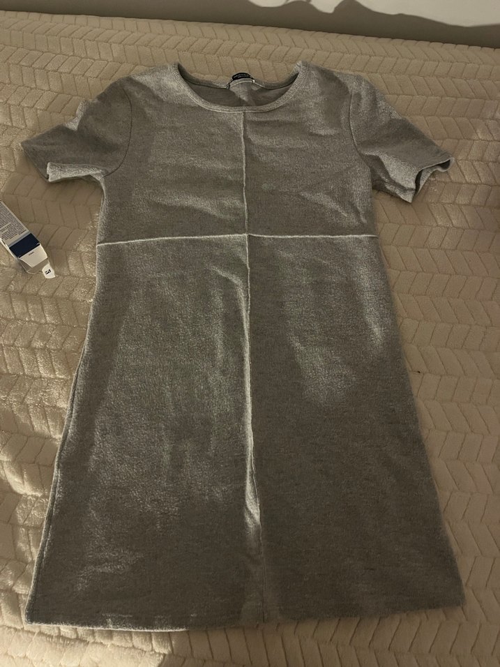 Kalın kumaştan yapılmış, kısa kollu ve yuvarlak yakalı, sade ve düz gri midi elbise. Rahat ve günlük sokak stili için uygun.