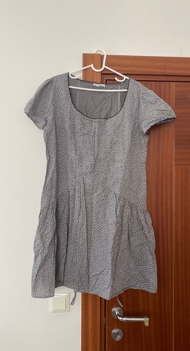 Gri midi elbise, kısa kollu ve bol kesimdir. Nefes alan keten kumaştan, drapeli ve yuvarlak yakalıdır. Günlük kullanım için uygundur.