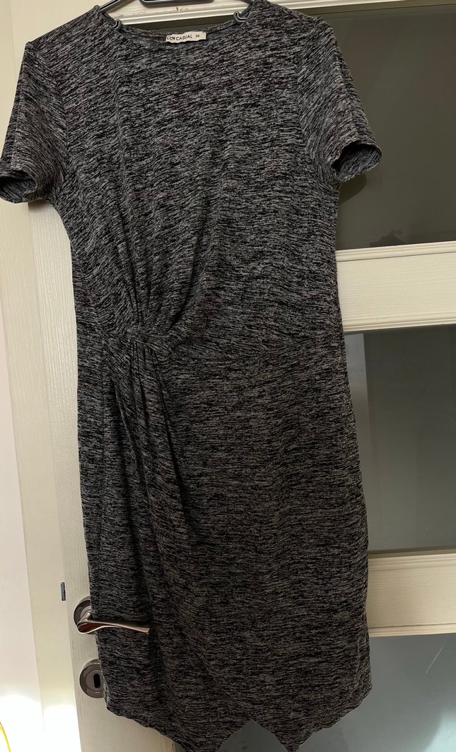 Kısa kollu, bisiklet yaka, gri triko elbise, belde drapeli detaylıdır. Keten kumaştan üretilmiş, minimalist ve normcore tarzda, ofis için uygundur.