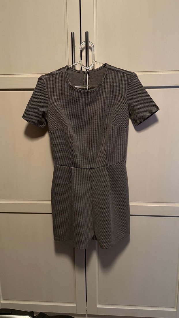 Dar kesim, kısa kollu ve bisiklet yaka gri tulum, minimalist ve sokak tarzı için uygun. Tok dokulu. Günlük kullanıma uygundur.