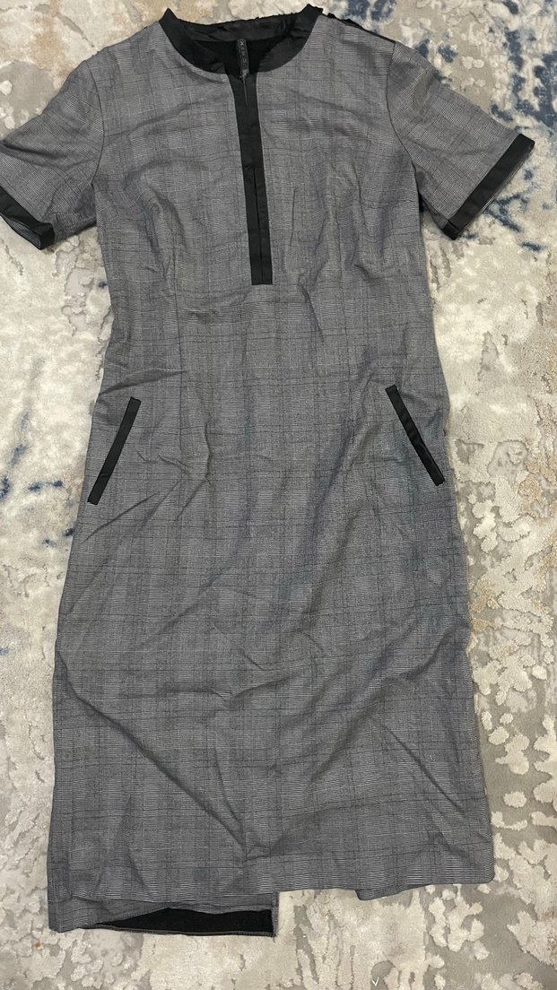 Gri uzun elbise kısa kollu ve kesik deri yaka detaylarına sahiptir. Fermuarlı ve regular fit, ofis ve sokak stiline uygundur. Sadece Boyun kısmının derisinde yıpranma vardır