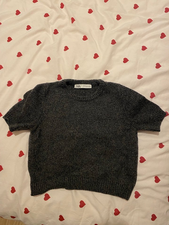 Gri renk, kısa kollu, yuvarlak yaka, bol kesim örgü kadın kazak. Rahat günlük kullanım için uygundur.