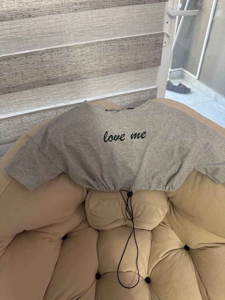 Gri renkli, kısa kollu, yuvarlak yaka ve bol kesime sahip kadın sweatshirtü. Yumuşak keten kumaştan örme dokuda, "love me" baskılı ve kısa mini boyda, ip detaylıdır. Rahat sokak stili için uygundur.