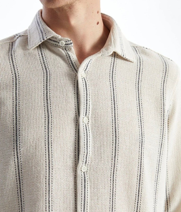 Gri renkte, ince dikey çizgili, kısa kollu, düğmeli ve yakalı, pamuklu kumaştan rahat kesim erkek gömleği. Günlük kullanıma uygun casual tarzda.