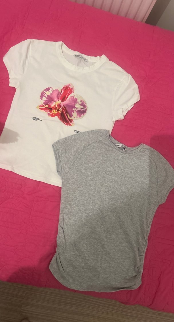 Pamuklu, kısa kollu, gri hamile tişörtü, fitted kesim ve yuvarlak yaka ile günlük rahatlık sağlar. Sokak stiline uygun, zahmetsiz şıklık sunar. 2 tişört