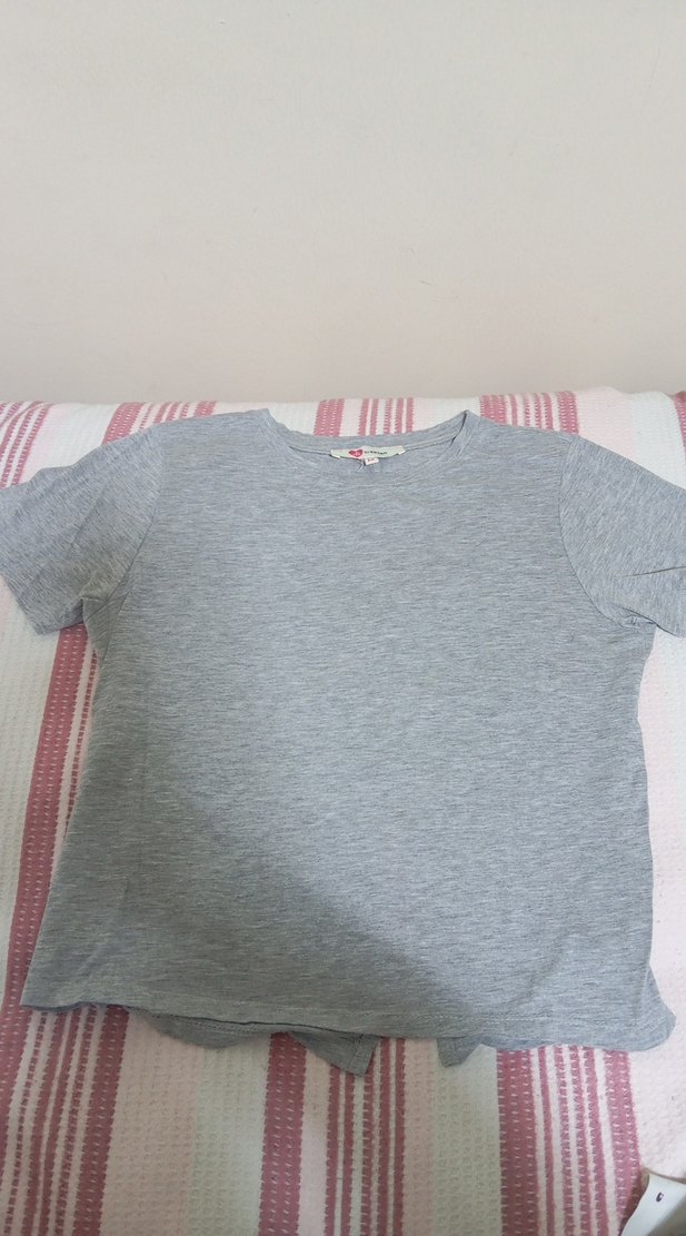 Gri renk, kısa kollu, yuvarlak yakalı, pamuklu kumaştan yapılmış bol kesim kadın tişört. Rahat ve sade, günlük kullanım için uygun. sırt detaylı