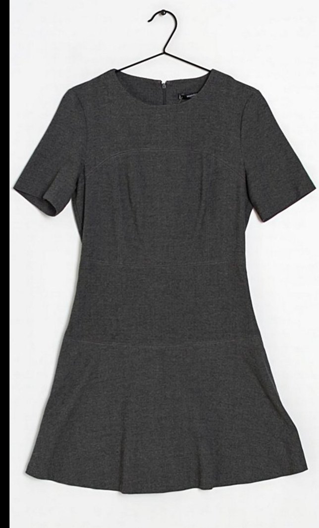 Kısa kollu, yuvarlak yakalı, vücuda oturan gri triko elbise. Midi boyda, piliseli detaylarla iş ortamına uygun sade tasarım sunar.