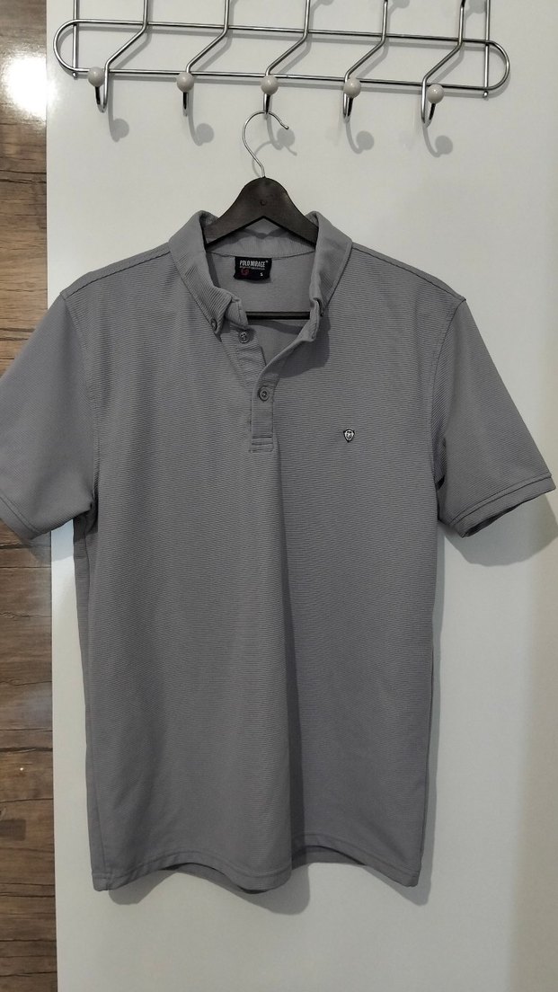 Gri renkte, kısa kollu, düğmeli yakaya sahip, regular fit erkek polo tişört. Sentetik kumaştan üretilmiş, günlük ve rahat sokak stili için uygun. ANKARA İÇİ ELDEN SATIŞ İMKANI BULUNUR